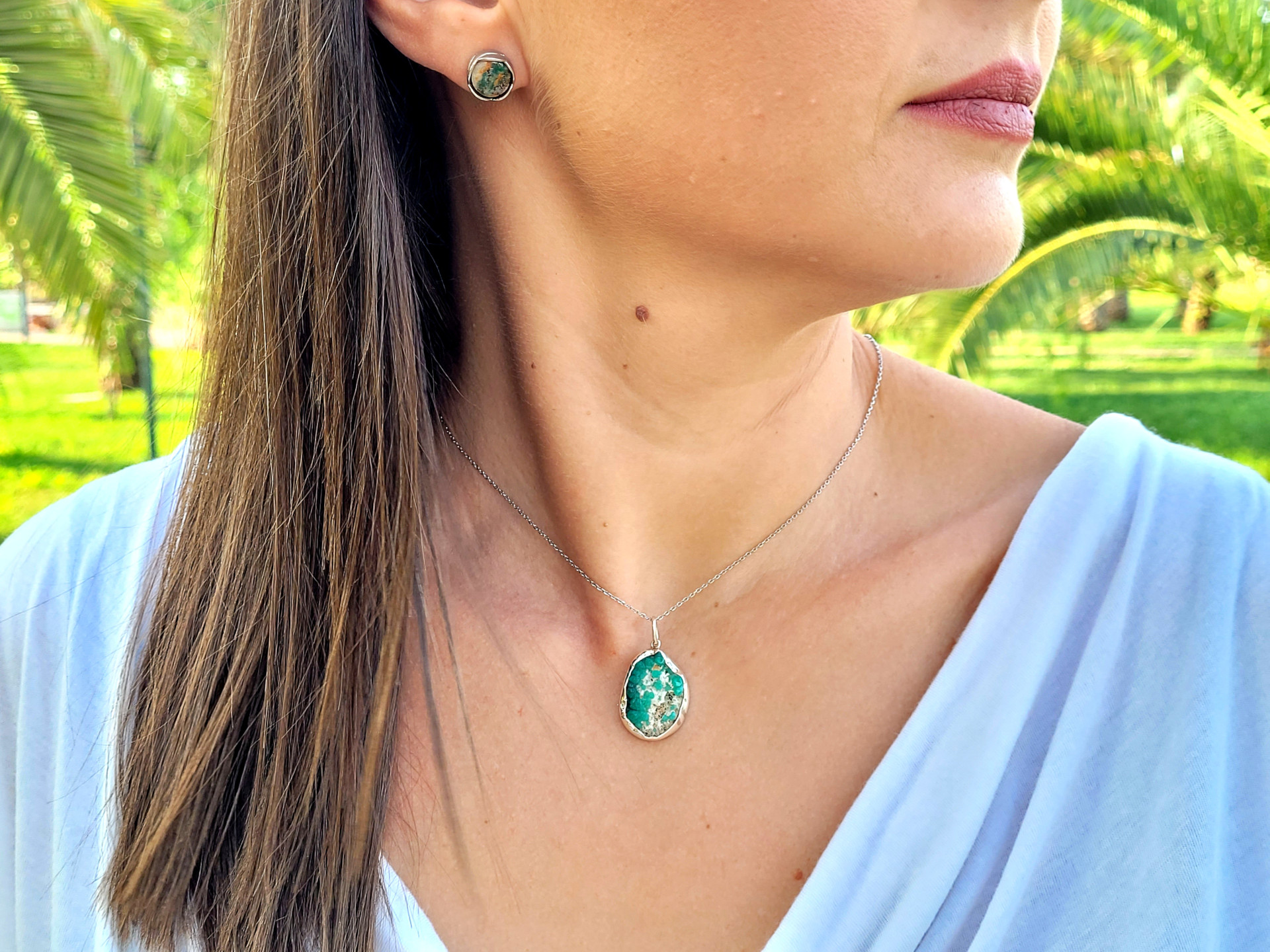 This Adamite Earrings is a stunning addition to any jewelry collection. Its unique design is a statement piece that will highlight any outfit. Featuring natural and raw adamite stone, this pendant offers a unique look that is sure to impress.