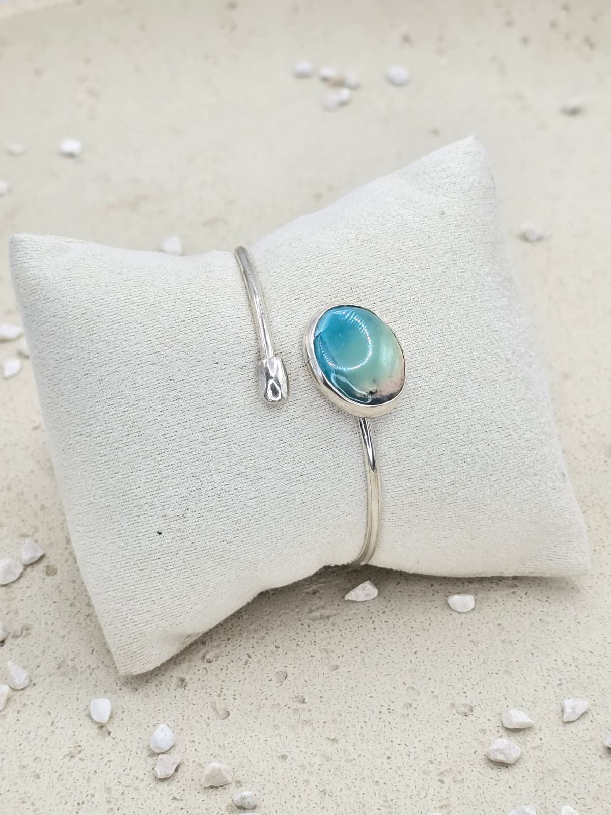 This exquisite bracelet features the deep white blue color of the sky intertwined with delicate smithsonite gemstones, creating a harmonious blend of elegance.