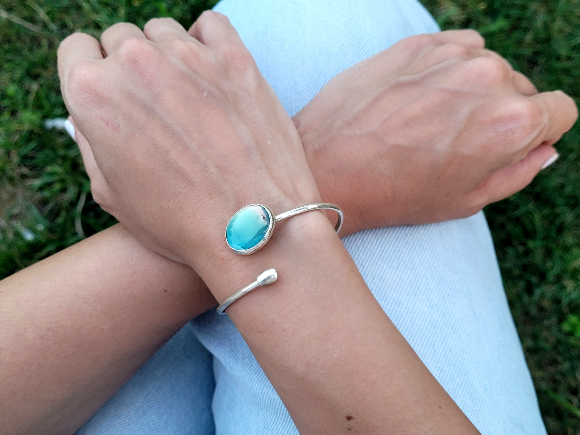 This exquisite bracelet features the deep white blue color of the sky intertwined with delicate smithsonite gemstones, creating a harmonious blend of elegance.