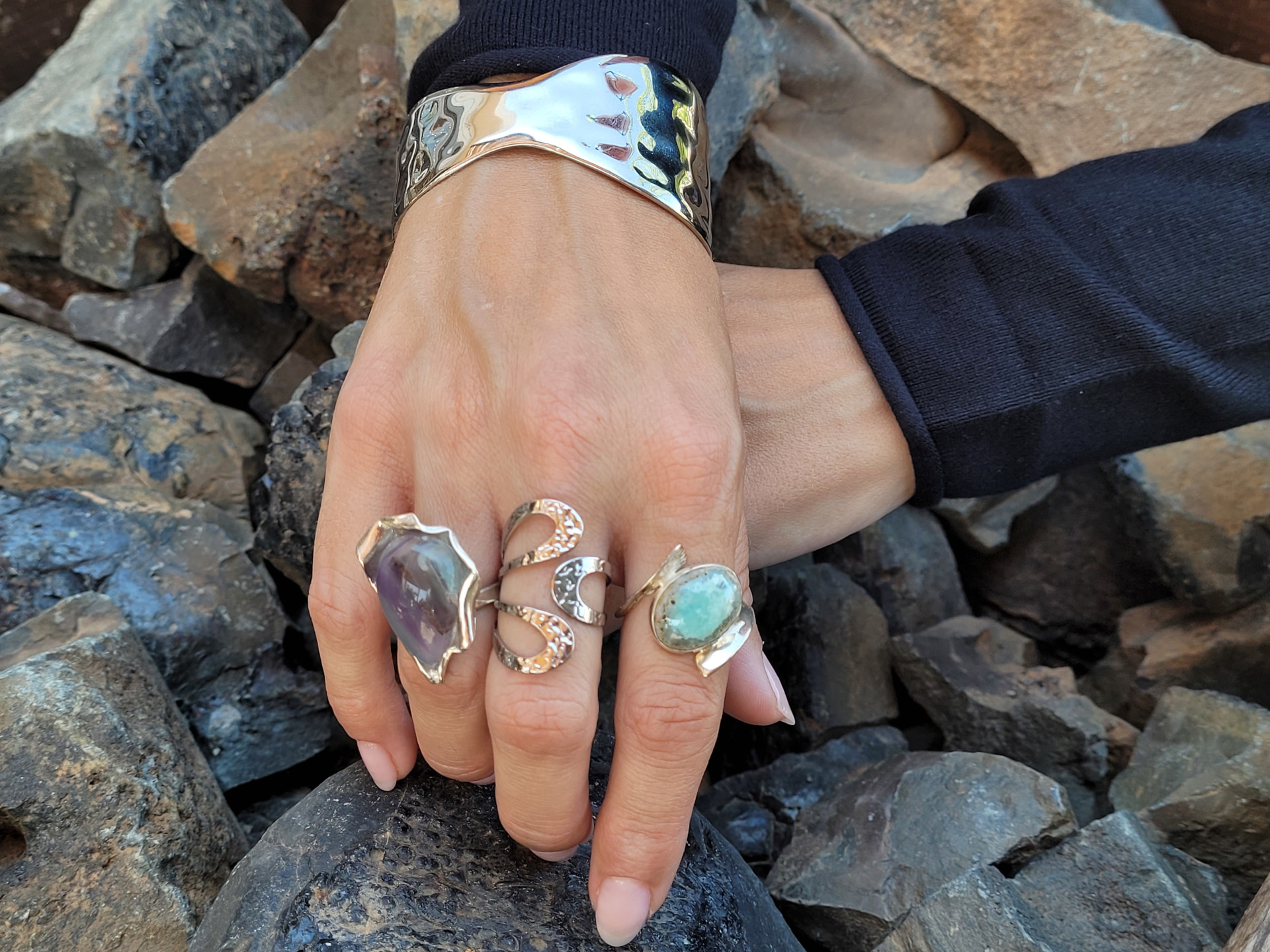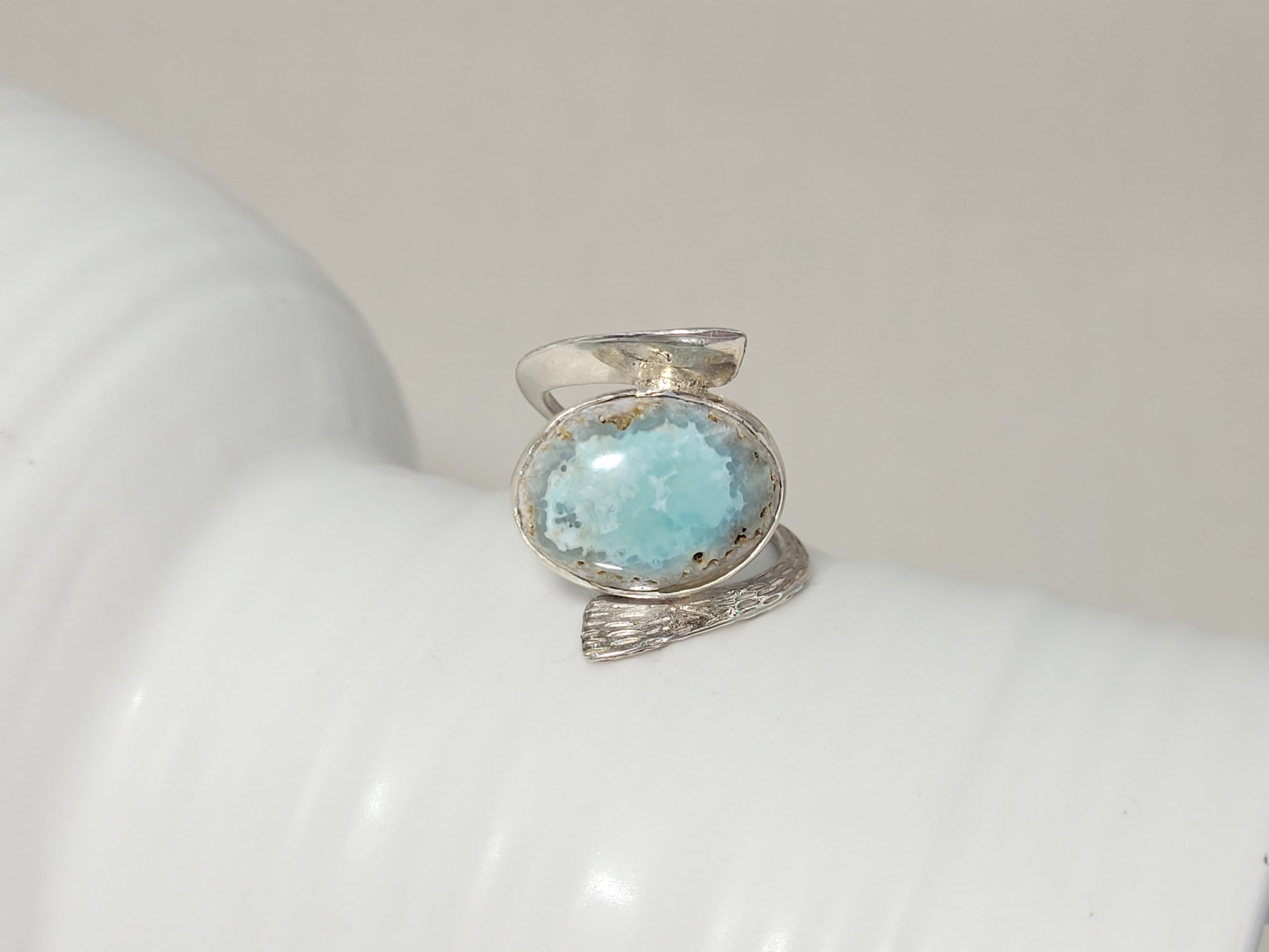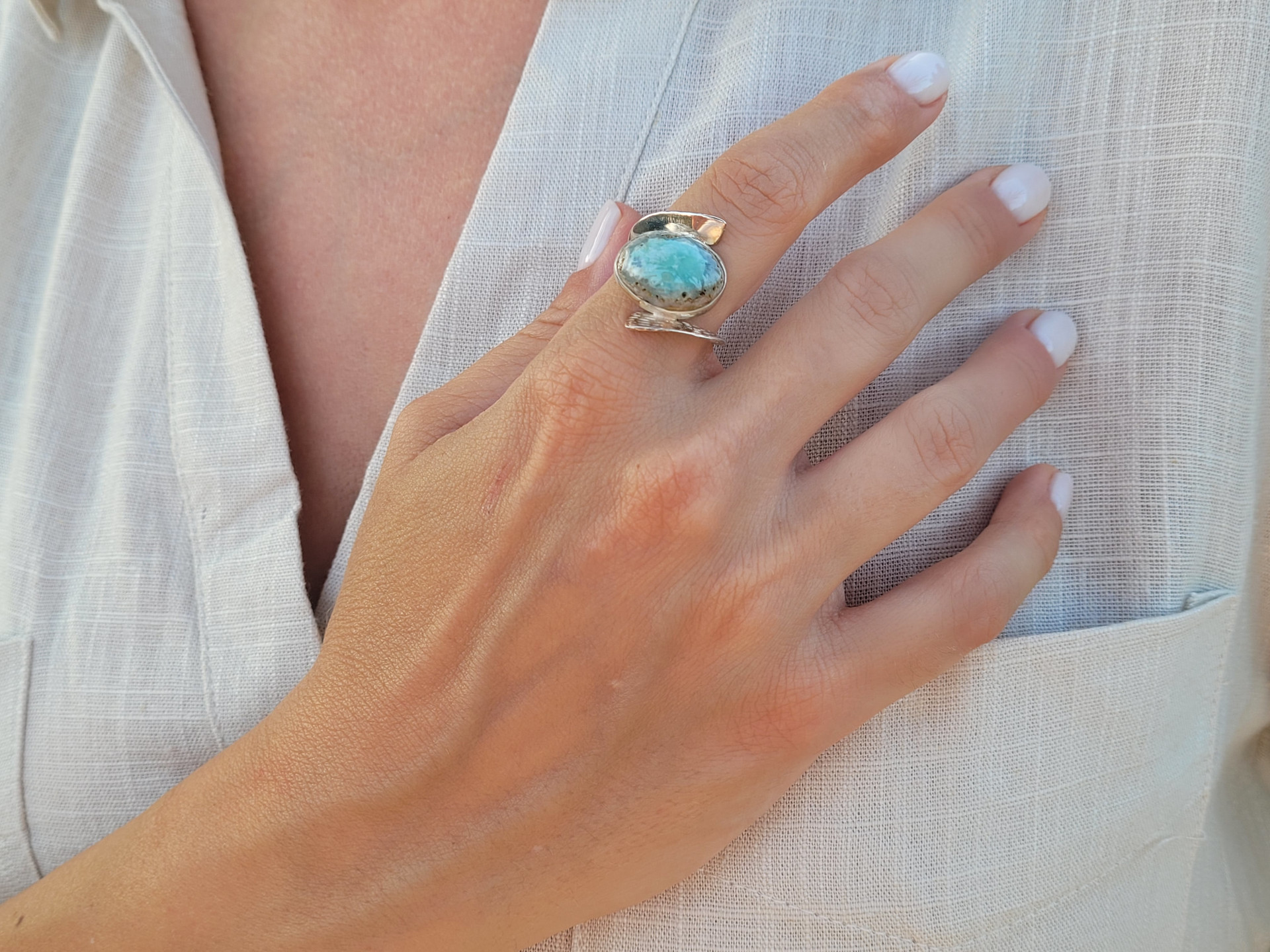 This exquisite ring features the deep white blue color of the sky intertwined with delicate smithsonite gemstones, creating a harmonious blend of elegance.